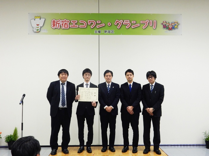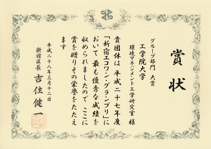 2016年3月12日(土)、2015年度「第9回 新宿エコワン・グランプリ」において環境マネジメント工学研究室(環境化学科 指導教員:稲葉 敦教授)がグループ部門の新宿エコワン・グランプリ大賞(区長賞)を受賞しました。