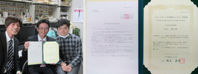 2016年3月7日に開催された2016年 日本建築仕上学会の研究発表において、建築学科4年(田村研究室)杉山 恵太さんが「ペット共棲住空間の壁面における自然石調内装仕上げへの引掻き傷の物理特性と印象評価」による研究発表で、学生研究奨励賞を受賞しました