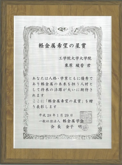 化学応用学専攻修士課程2年生の栗原綾香さん(無機表面化学研究室)が、研究題目「アルミニウムアノード酸化皮膜の白色度に及ぼすポーラス構造の影響」で、平成27年度「軽金属希望の星賞」を受賞しました。この賞は軽金属の学業の向上発展を奨励し、軽金属の未来を担う人材の育成を目的として人格・学業ともに優秀な学生に贈られる賞で、候補者は指導教員および各支部の支部長により推薦された後、軽金属学会の理事会により選出されました。平成27年度の軽金属希望の星賞は全国の学生会員の中から栗原さんを含め33名が受賞されました。