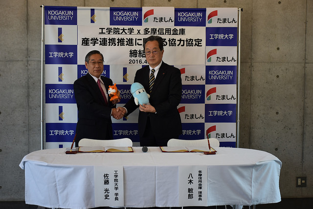 4月12日、八王子キャンパスの総合教育棟を会場に、多摩信用金庫と産学連携推進に関する協力協定の締結式を行いました。