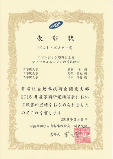 2016年3月9日、2015年度自動車技術会関東支部学術研究講演会(自動車技術会関東支部)において、機械工学科4年(内燃機関研究室)熊谷 翼さんと矢部 祐也さんが、「エマルジョン燃料によるディーゼルエンジンの汚れ除去」に関する研究でベストポスター賞を受賞。