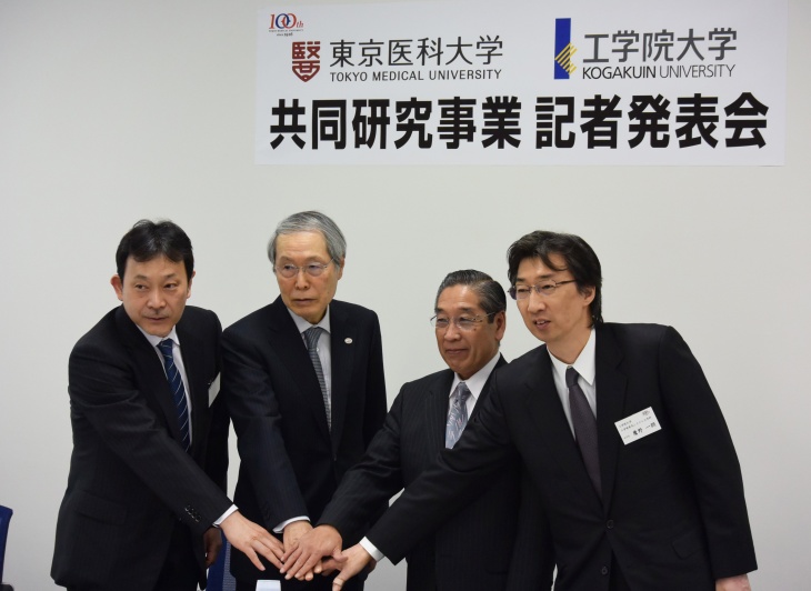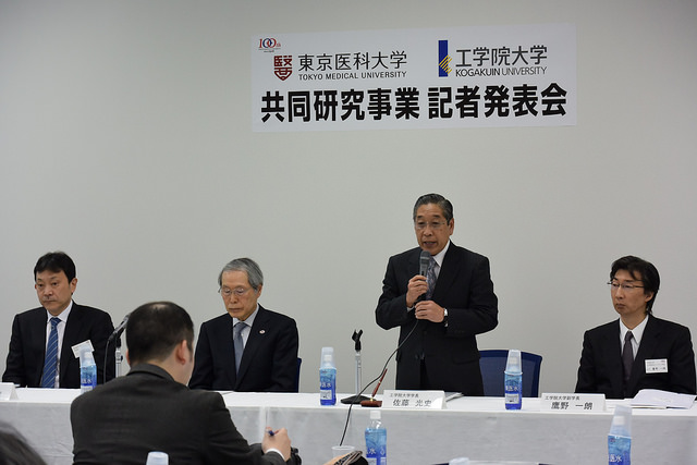 記者発表会では佐藤光史学長より、東京医科大学の創立100周年のお祝いと共同研究に取り組む感謝が述べられ、本学の建学の理念である「社会・産業と最先端の学問を幅広くつなぐ『工』の精神」が東京医科大学との共同研究により医学分野へも波及し、私たちの想いが生かされいく。今後、ますますの研究発展を願いますとのメッセージが送られました。