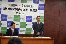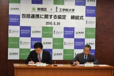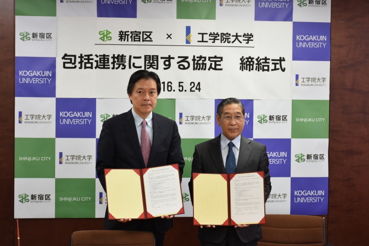 大学の教育・研究の充実を図り、地域社会の発展に寄与することを目的に、新宿区と包括連携に関する協定を結び2016年5月24日、新宿区役所にて締結式を行いました。