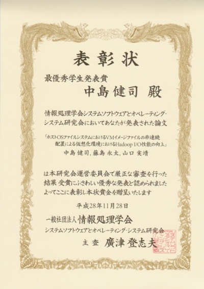 2016年5月30日~31日に開催された情報処理学会 システムソフトウェアとオペレーティング・システム研究会において、電気・電子工学専攻1年(ネットワークコンピューティング研究室)中島健司さんが「ホストOSファイルシステムにおけるVMイメージファイルの非連続配置による仮想化環境におけるHadoop I/O性能の向上」による研究発表で、最優秀学生発表賞を受賞しました。