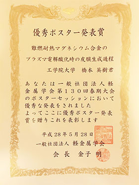 橋本英樹助教(応用化学科)が、2016年5月28日、一般社団法人軽金属学会第130回春季大会のポスターセッションにおいて優秀ポスター発表賞を受賞されました。