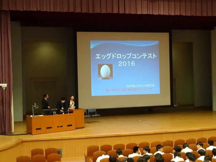 衝撃吸収メカニズムについて研究を進める塩見誠規教授(先進工学部機械理工学科)が、本学と教育連携協定を結ぶ文京学院大学女子高等学校で6月11日に開催された「エッグドロップコンテスト・2016」において、特別講義および審査員を務めました。
