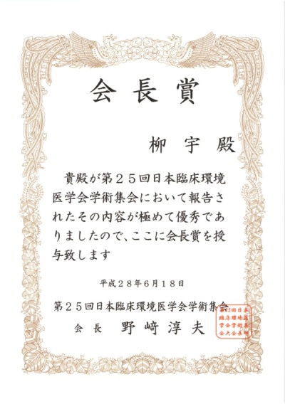 第25回日本臨床環境医学会学術集会での報告内容が「極めて優秀」と評価されました。