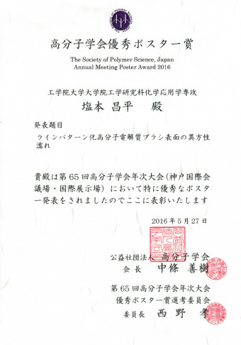 本学大学院工学研究科化学応用学専攻1年の塩本昌平さんが5月25日-27日に神戸国際会議場で行われた第65回高分子学会年次大会にて「ラインパターン化高分子電解質ブラシ表面の異方性濡れ」について発表し、優秀ポスター賞を受賞しました。