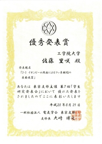 8月29日に開催された電気学会東京支部第7回学生研究発表会において、電気システム工学科生(電気応用システム研究室)4年岩崎賢司さん、佐藤里咲さん、瀬川大志さんの3名が優秀発表賞を受賞しました。