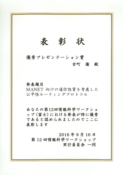 Home 2016年度のお知らせ 情報学専攻生が第12回情報科学ワークショップで優秀プレゼンテーション賞を受賞 情報学専攻生が第12回情報科学ワークショップで優秀プレゼンテーション賞を受賞 2016/10/11 シェアする 2016年9月14日~16日に開催された第12回情報科学ワークショップにおいて、情報学専攻2年(分散アルゴリズム研究室)吉町 優さんが「MANET向けの通信性質を考慮した公平性ルーティングプロトコル」による研究発表で、優秀プレゼンテーション賞を受賞しました。 受賞コメント 優秀プレゼンテーション賞をいただくことができ、大変嬉しく感じています。今後も良い研究成果を出せるよう日々努力します。 分散アルゴリズム研究室 情報学専攻 大学院の活動・実績 前へ 一覧に戻る 次へ