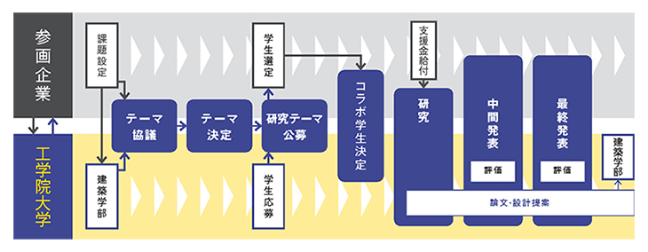 コラボ学生は、企業からのコラボ支援金を有効活用しながら、その成果を論文や設計提案としてまとめ、参画企業の経営陣や研究テーマに関連した部署のリーダーなども出席する最終発表会の場でプレゼンテーションし、評価を受けます。プログラムが本格的にスタートした今年度は、建築学部の学生11名(10組)が、来年2月の最終発表会に向けて課題研究に取り組んでいます。