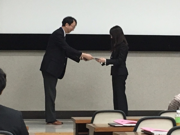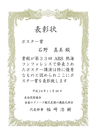 2016年10月27日に開催された一般社団法人表面技術協会 金属のアノード酸化皮膜の機能化部会(ARS)第33回コンファレンスにおいて、化学応用学専攻1年(無機表面化学研究室)石野真美さんが「間接アノード酸化によるナノポーラスアルミナ皮膜の作製」による研究発表で、ポスター賞を受賞しました。