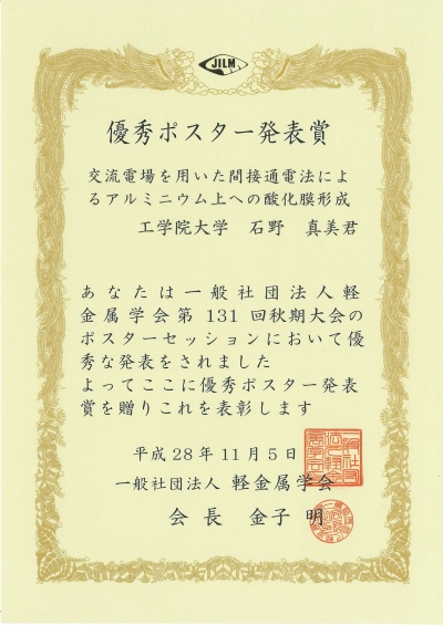 2016年11月5日に開催された一般社団法人軽金属学会第131回秋期大会(茨城大学・水戸キャンパス)において、化学応用学専攻1年(無機表面化学研究室)石野真美さんが「交流電場を用いた間接通電法によるアルミニウム上への酸化膜形成」による研究発表で、優秀ポスター賞を受賞しました。