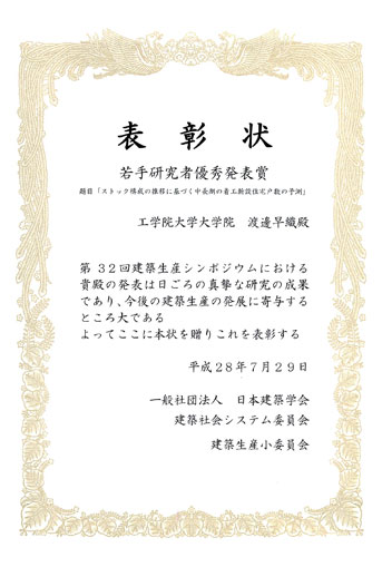 2016年7月29日に開催された日本建築学会 第32回建築生産シンポジウムにおいて、建築学専攻2年(遠藤和義研究室)渡邊 早織さんが「ストック構成の推移に基づく中長期の着工新設住宅戸数の予測」による研究発表で、若手研究者優秀発表賞を受賞しました。