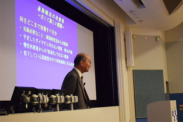 はじめに登壇したのは、電気工学の視点から、信号、ダイヤ、車両の研究・設計に長年携わってきた曽根悟特任教授。日本を代表する工学者・鉄道技術者として知られる曽根教授は、講義の冒頭で「日本の首都圏の鉄道は、破局的状況にある」と分析。鉄道関係者も多く出席した会場の空気が引き締まります。