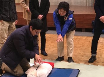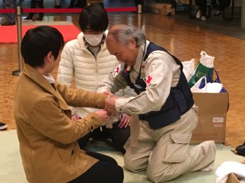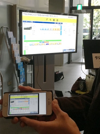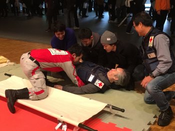 訓練会場の一角では、Wi-Fi使った非常時の情報システムの実証実験や心臓マッサージや受傷者を担架に乗せる講習などが行われました。