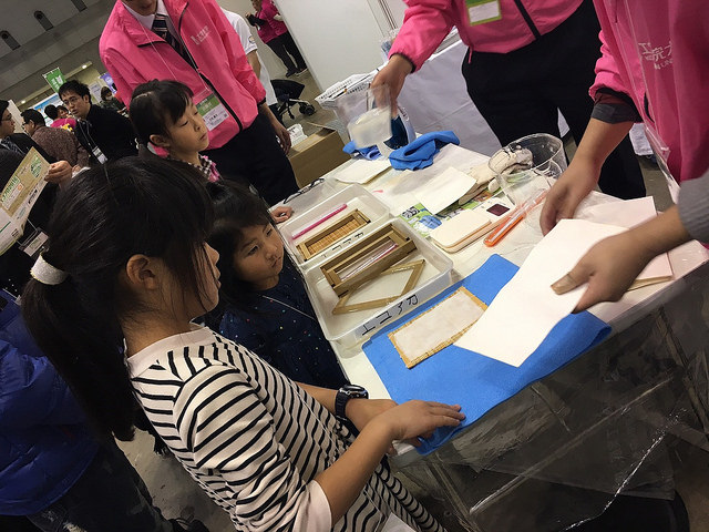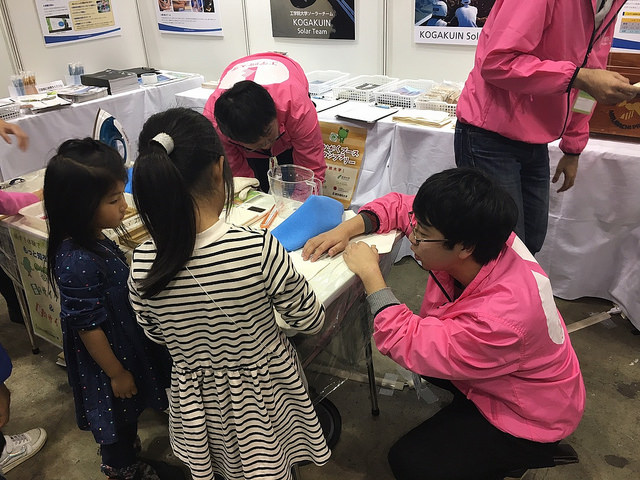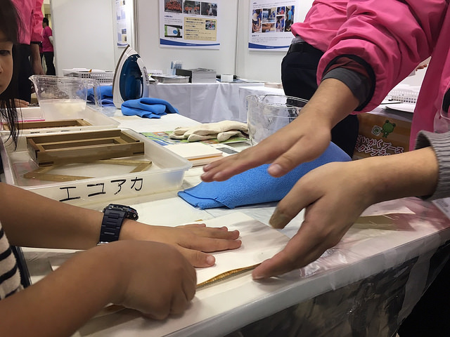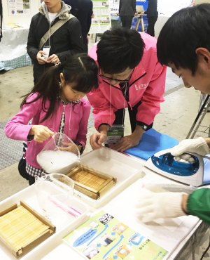 10日には、環境ISO学生委員会が「紙抄き体験」を開催。多くの方が、学生に教わりながらハガキを手作りしました。盛況で、用意した材料を使い切るほど。紙抄きの材料提供と技術指導は三菱製紙株式会社様および三菱製紙販売株式会社様、来場者への説明と体験補助は工学院大学学生と、産学が連携して開催した初めての学外開催は、大成功を収めました。
