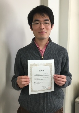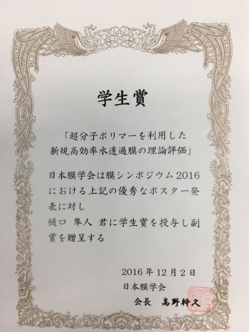 2016年12月1日に開催された日本膜学会において、環境エネルギー化学科4年(計算化学工学研究室)樋口 隼人さんが「超分子ポリマーを利用した新規高効率水透過膜の理論評価」による研究発表で、学生賞を受賞しました。