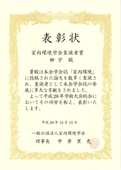 柳宇教授(建築学科)が「室内環境」に投稿された論文を数多く査読され、査読者者として室内環境学会誌の発展に多大なる貢献をされたとして、12月15日、同学会の「査読者賞」を受賞しました。