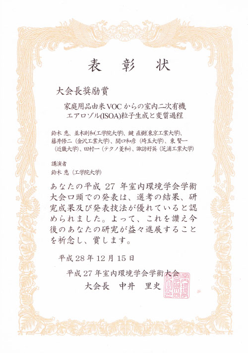 本学大学院化学応用学専攻の鈴木 恵さん(当時修士2年)が、平成27年度室内環境学会大会長奨励賞を受賞し、2016年12月15日に開催された同学会総会で表彰されました。同賞は、平成27年度の学術大会口頭発表で、研究成果及び発表技法が優れている方に贈られる賞です。今回受賞対象となった研究発表は、『家庭用品由来VOCからの室内二次有機エアロゾル(ISOA)粒子生成と変質過程』です。