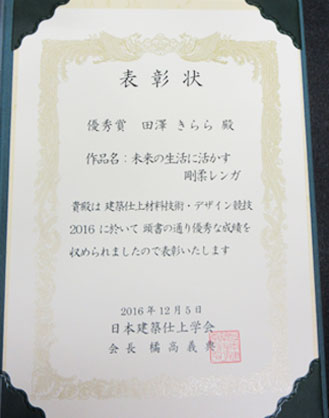 日本建築仕上学会が主催する「建築仕上材料技術・デザイン競技2016」において、建築学科4年(鈴木研究室:指導教員 鈴木敏彦教授)の田澤きららさんが優秀賞を受賞しました。