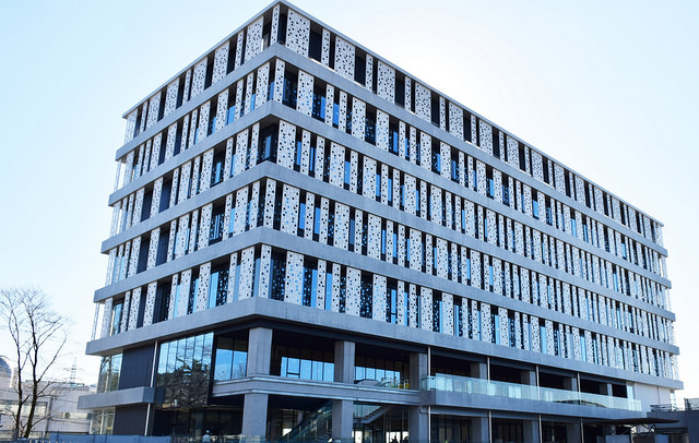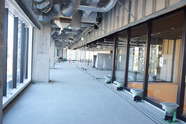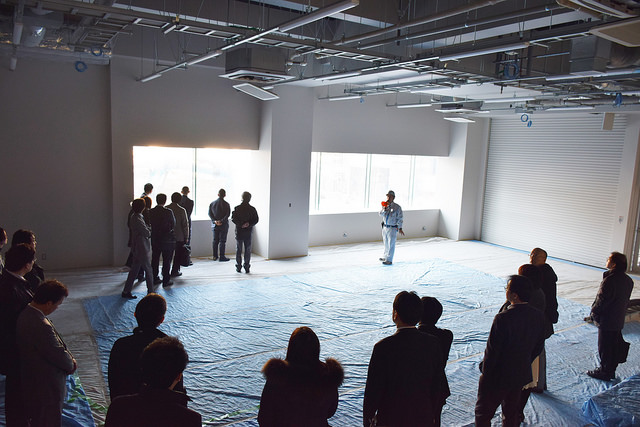 新年会終了後、4月より供用開始となる新2号館の見学が行われました。新2号館は、隣接する附属中学・高校をつなぐシンボルとして、また、図書館を内部に配し情報教育や学習サポート機能を取り込んだ学生の主体的な学びの場「ラーニング・コモンズ」を中心とした教育施設となります。本日の見学会では、インテリアデザインを手がけた塩見一郎教授(建築デザイン学科)や飯島直樹先生(建築デザイン学科元教授)が説明に立たれました。