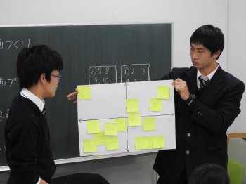 昨年11月に実施した2度目のミーティングでは、プログラムを担当する教諭進行のもと、生徒各自が考えたプレゼンのアイデアをグループで共有しました。併せて「現地の生徒にとって深い内容か、楽しい内容か」「実現するのは簡単か、難しいか」の軸に当てはめ、分類する作業に取り組みました。
