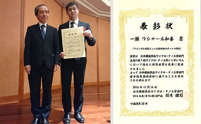 Home 2016年度のお知らせ 機械工学専攻生が第7回マイクロ・ナノ工学シンポジウムにおいて若手優秀講演表彰を受賞しました 機械工学専攻生が第7回マイクロ・ナノ工学シンポジウムにおいて若手優秀講演表彰を受賞しました 2017/01/20 シェアする 2015年10月30日に開催された日本機械学会主催 第7回マイクロ・ナノ工学シンポジウムにおいて、機械工学専攻2年(マイクロシステム研究室)一瀬リシャール和喜さんが「アメンボを規範とした水面移動ロボットの開発」による研究発表で、若手優秀講演表彰を受賞しました(表彰式は2016年12月16日)。 受賞コメント 学会賞を、ありがとうございました。指導してくれた鈴木健司教授をはじめに、お世話になった多くの方々に心から感謝申し上げます。 マイクロシステム研究室 機械工学専攻 大学院の活動・実績 前へ 一覧に戻る 次へ
