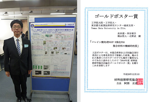 2016年12月3日に開催された2016年度材料技術研究協会討論会において、機械工学専攻2年(高分子材料研究室)長田 遊さんが「マレイン酸処理VGCF-X強化PA6複合材料の機械的性質」による研究発表で2016年度材料技術研究協会討論会ゴールドポスター賞を受賞しました。