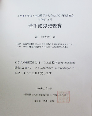 2016年8月24日に開催された日本建築学会において、建築学専攻2年(田村雅紀研究室)岡 健太郎さんが「建築物のLCM における維持保全と保存的活用ストラテジー その9 既存木摺漆喰天井における補修効果の検証」による研究発表で、日本建築学会・材料施工委員会若手優秀発表賞を受賞しました。
