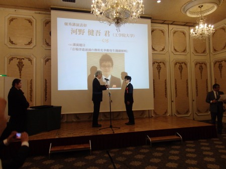 2016年11月12日~13日に開催された日本機械学会第94期流体工学部門講演会において、機械工学専攻2年(伝熱工学研究室)河野 健吾さんが「音場浮遊液滴の微粒化挙動の発生機構の解明」による研究発表で、優秀講演表彰を受賞しました。