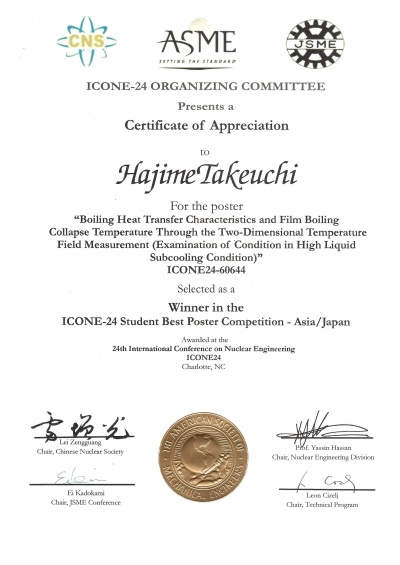 2016年6月26日~30日に開催された24th International Conference on Nuclear Engineeringにおいて、機械工学専攻1年(伝熱工学研究室)竹内 啓さんが「BOILING HEAT TRANSFER CHARACTERERISTICS AND FILM BOILING COLLAPSE TEMPERATURE THROUGH THE TWO-DIMENSIONAL TEMPERATURE FIELD MEASUREMENT」による研究発表で、ICONE-24 Student Best Poster Competition Asia/Japanを受賞しました。