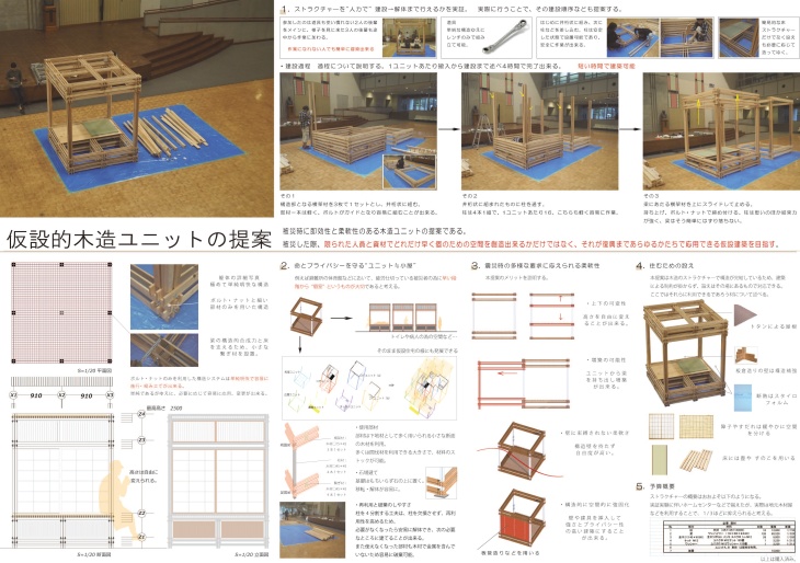 Home 2016年度のお知らせ 建築学専攻生が『今を生きるカセツのカタチ-災害時の避難場所における可能性-』において優秀賞を受賞 建築学専攻生が『今を生きるカセツのカタチ-災害時の避難場所における可能性-』において優秀賞を受賞 2017/03/30 シェアする 2016年10月23日に開催された今を生きるカセツのカタチ-災害時の避難場所における可能性-において、建築学専攻2年(木下庸子研究室)宮内 智也さんが「仮設的木造ユニットの提案」による研究発表で、優秀賞を受賞しました。 受賞コメント 即日実施を行う、変則コンペテションである。木造ユニットは修士研究にも関わるシステムであるが、今回の様に、他の分野にも応用が可能であることを証明できた。 画像クリックでPDFをご覧いただけます 木下研究室 建築学専攻 大学院の活動・実績 前へ 一覧に戻る 次へ