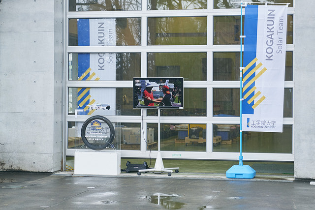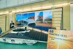 会場内には、10月にオーストラリアで開催される世界大会に3度目の出場を表明したソーラーチームの学生たちが製作した2号機(初めて世界の舞台を経験した2013年世界大会参戦車両:Practice)実車と実車に近いサイズで製作した3号機(4月20日開幕の上海モーターショーに出展のため実車展示ではなくパネル展示となった。2015年の世界大会でクラス準優勝、2016年の国内大会では大会新記録を樹立し総合優勝を果たした:OWL)のパネルが展示され、新入生らを出迎えました。