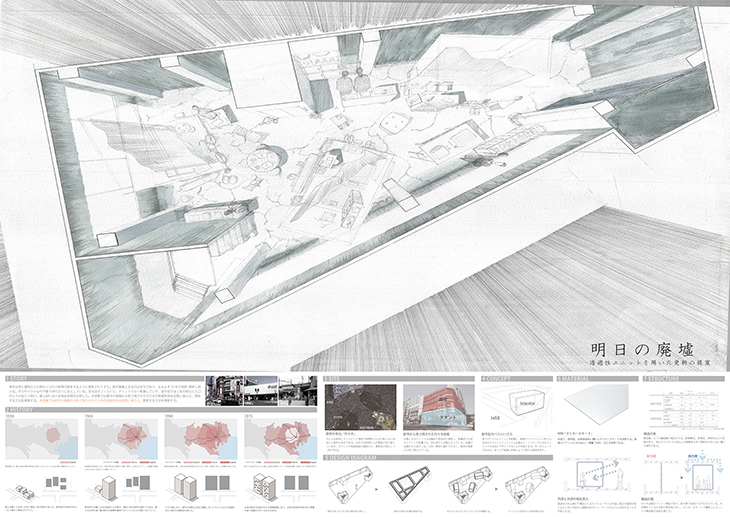 2016年8月3日に開催された2016年度 日本建築学会設計競技「残余空間に発見する建築」において、建築学専攻2年(木下庸子研究室)宮内 智也さんと(澤岡清秀研究室)小松 恭士さんが「明日の廃墟」による研究発表で、全国1 次審査会通過、関東支部入選を果たしました。