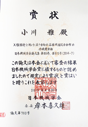 小川雅助教(機械システム工学科)の単著論文(タイトル:X線回折を用いた深さ方向の溶接残留応力分布の非破壊評価)が、2017年4月20日、日本機械学会賞(論文)を受賞しました。