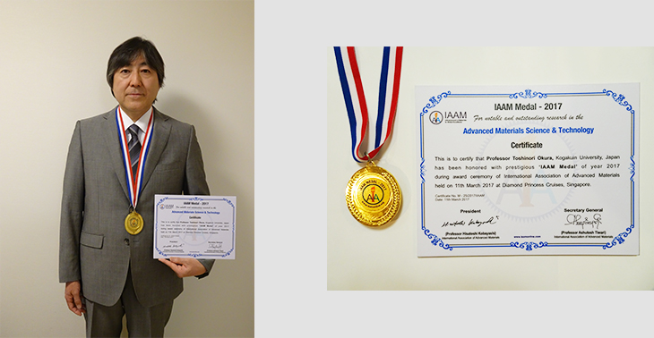 大倉利典教授(応用化学科)が「International Association of Advanced Materials (IAAM)」 より「IAAM Medal - 2017」を受賞しました。2017年3月11日~16日に Diamond Princess Cruise 船上で開催された Asian Advanced Materials Congress (ASAMC) 2017 において受賞式が行われ、招待講演「Synthesis and Na+ conduction properties of Narpsio glass-ceramics」を行いました。