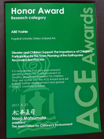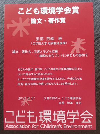 単著『災害と子ども支援 復興のまちづくりに子ども参加を』(学文社、2016)に対し、こども環境学会より論文・著作賞をいただけたことを、大変嬉しく受け止めています。これもひとえに、調査研究に協力してくださった支援者のみなさま、子どもたち、本書を手に取っていただいた読者のみなさまのおかげです。ここに立ち止まることなく、引き続き研究を深めていきたいと考えておりますので、今後ともよろしくお願いいたします。最後に、阪神・淡路大震災、中越大震災、東日本大震災をはじめとするさまざまな災害からの復興を心より祈念して、コメントとさせていただきます。ありがとうございました。