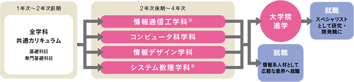 工学院大学情報学部は、2006年にコンピュータ科学科と情報デザインの2学科で開設、2016年度には情報通信工学科とシステム数理学科を新設し、現在は4学科入学定員310名の学部に発展しています。コンピュータ、ネットワーク、セキュリティ等の情報技術を多くの実験・演習科目を含む体系的なカリキュラムで学び、卒業生は情報技術者、研究者等としてさまざまな業界で活躍しています。