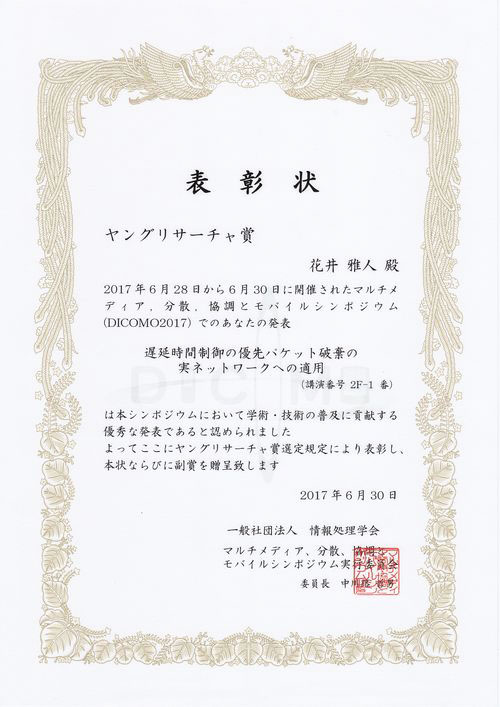 2017年6月28日~30日に開催された情報処理学会マルチメディア、分散、協調とモバイルシンポジウムプログラム委員会 DICOMO2017において、電気・電子工学専攻2年(メディア情報システム研究室)花井 雅人さんが「遅延時間制御の優先パケット破棄の実ネットワークへの適用」による研究発表で、ヤングリサーチャー賞を受賞しました。