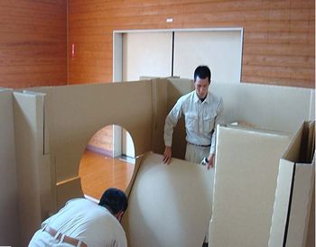 今回、7月11~14日にかけて九州北部を中心に発生した福岡北部豪雨に際し、戸田建設九州支店から朝倉市へ被災地支援の申し出を行い協議の結果、4つのタイプを備えたダンボールシェルターのうち、大空間を一度に簡単に間仕切ることができる屋根のないタイプのダンボールシェルターで、かつ、夏場に適した造りになっている「クロスウォールシステム」を提供しました。