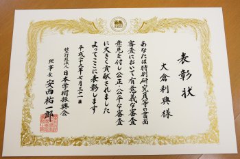 大倉利典教授(応用化学科)が、日本学術振興会より、特別研究員等審査会専門委員及び国際事業委員会書面審査委員の業績について、有意義な意見を付し、公正・公平な審査に大きく貢献したとして、表彰を受けました。