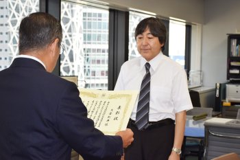 大学に届いた表彰状を学長から受け取る 大倉利典教授(応用化学科)