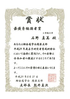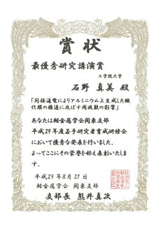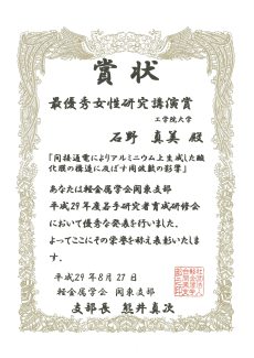 2017年8月27日に開催された軽金属学会関東支部 平成29年度 若手研究者育成研修会において、化学応用学専攻2年(無機表面化学研究室)石野 真美さんが「間接通電によりアルミニウム上に生成した酸化膜の構造に及ぼす周波数の影響」による研究発表で、最優秀研究講演賞、最優秀女性研究講演賞および最優秀聴講者賞を受賞しました。