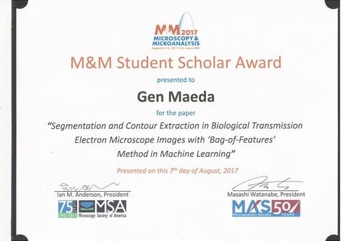 2017年8月6日~8月10日に開催されたMicroscopy & Microanalysis 2017, Microscopy Society of America, Microanalysis Societyにおいて、情報学専攻博士課程1年(ナノ領域知能画像処理研究室)前田 元さんが「Segmentation and Contour Extraction in Biological Transmission Electron Microscope Images with 'Bag-of-Features' Method in Machine Learning」による研究発表で、M&M Student Scholar Awardを受賞しました。