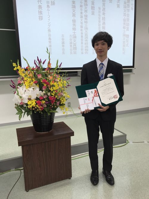 この度、名誉ある日本建築学会卒業論文賞を頂くことができ、大変嬉しく思っております。ご指導頂いた星先生をはじめ、星研究室関係者各位、情報提供して頂いた市役所の職員の皆様に感謝申し上げます。今回の受賞を励みに、より一層精進していきたいと思います。。