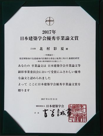 2017年8月31日に開催された日本建築学会主催第28回「優秀卒業論文賞」「優秀修士論文賞」において、建築学専攻1年(遠藤新研究室)北村彩夏さんが「指定解除後の生産緑地の計画的な保全と転用に向けた基礎的研究—神奈川県伊勢原市を対象として—」と題する研究発表で、日本建築学会「優秀卒業論文賞」を受賞しました。