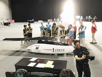 工学院大学の参戦マシン“Wing”がピット入りした際には、50人を超える各国のチームが見学に訪れ、特徴あるデザインの車体に注目が集まりました。また、自然界の美しいデザインを有するソーラーパネル部分の羽を中心に“オンリーワン”のデザインについて数多くの質問がソーラーチームの学生に投げかけられ、レース前から世界各国のチームの注目を集めています。チームは、10月3日に静的車検を受検し、7日に予選レースを兼ねた動的車検に臨みます。