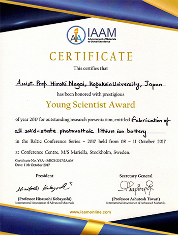 2017年10月8日から11日にストックホルムで開催されたIAAM(International Association of Advanced Materials)主催のBaltic Conference Seriesにおいて,先進工学部応用物理学科の永井裕己助教が「Fabrication of all-solid-state photovoltaic lithium-ion battery」と題する研究発表で,Young Scientist Awardを受賞しました。