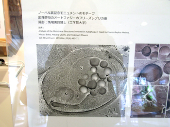 基礎生物学研究所の館内には、大隅先生のオートファジー研究について説明するパネルが並んでいます。そのパネルにも、馬場美鈴研究員が撮影した写真が多く使われています。この写真を原画にしてモニュメントが作られました。